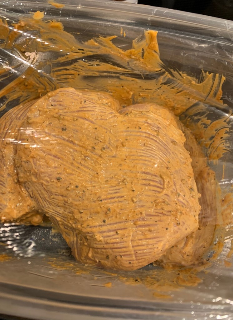 We decided to try this sauce on some boneless, skinless chicken breasts and cook it in the oven. It is suggested by the internet that marinating last at least 15-30 minutes…we marinated for two days! We wanted maximum flavor, our supervisory Chef on duty (we have two) suggested that we pat the chicken breasts with a paper towel to remove any moisture, sprinkle both sides with salt and pepper, then spread the sauce on both sides, and if we wanted to, add any other seasonings. We only added a little McCormick® Grill Mates® Roasted Garlic & Herb Seasoning.