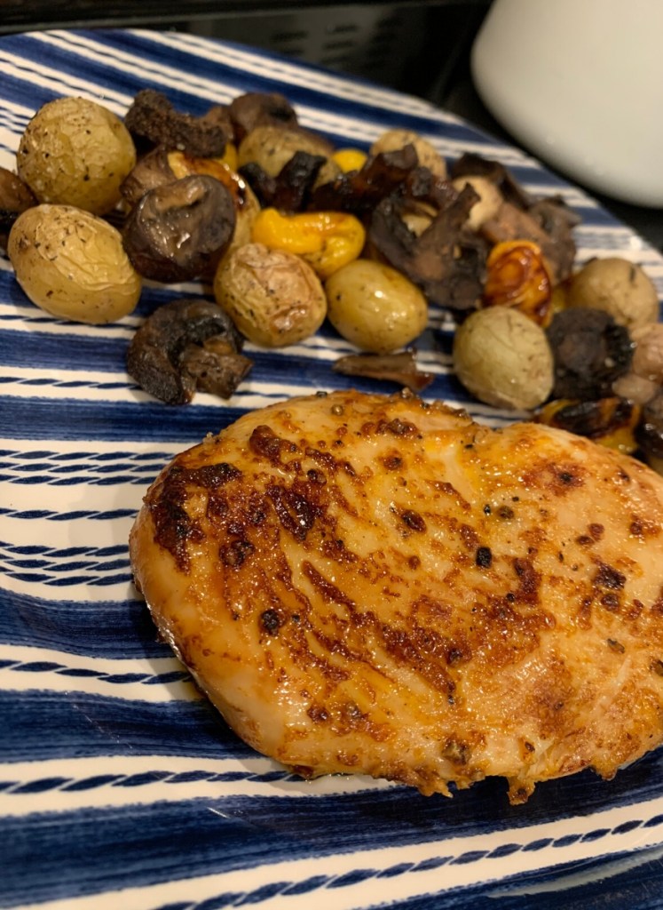 We let the chicken breasts marinate in the mayo in a plastic wrap sealed container for two days. Seems a little much? To be honest we got busy and were craving pizza so ordered out…okay we got lazy. Back to the chicken. To cook it, we preheated the oven to 400º and placed the chicken breasts on a foil lined cookie sheet. On the other side of the cookie sheet we tossed, sliced mushrooms, Comets™ tomatoes, and whole baby potatoes in extra virgin olive oil, salt and pepper. The cookie sheet roasted in the oven for 45 minutes…OH THE SMELL!