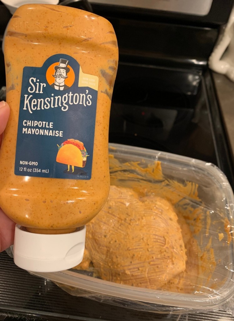 - Spread Sir Kensington’s Chipotle Mayo on both sides of chicken breasts with brush or spoon.
