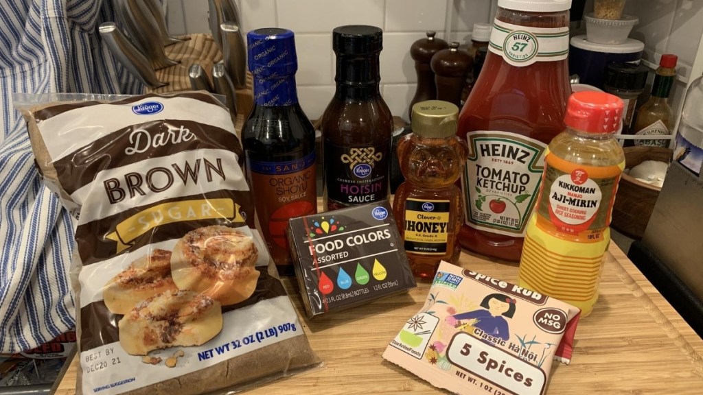 - Stir soy sauce, honey, ketchup, brown sugar, Mirin, hoisin sauce, red food coloring or red bean curd, and five-spice powder together in a saucepan over medium-low heat.