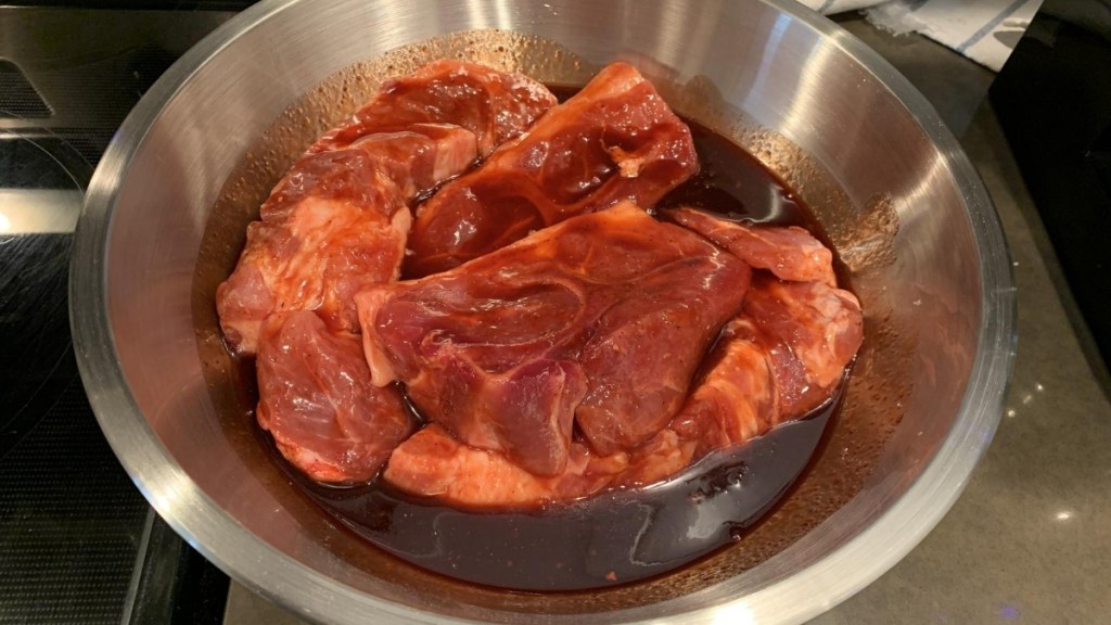 - First we poured the marinade into a bowl and rolled the ribs around the marinade. Next, pour the marinade into a bag with the ribs, squeeze the air from the bag, and seal. Turn bag a few times to coat all pork pieces in marinade.