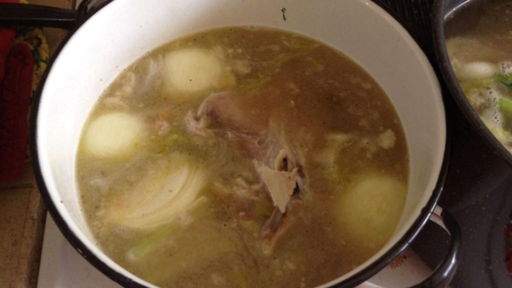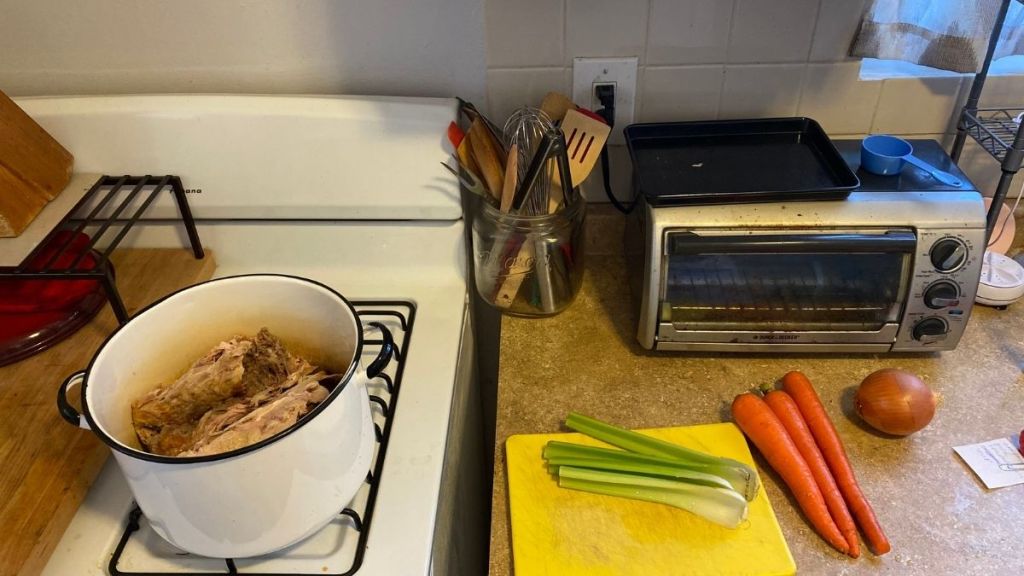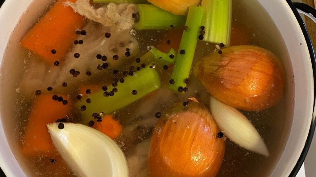 Turkey carcass, chicken bones, practically anything can go into the pot. I recently used chicken drumsticks and it worked perfectly. You can even do a whole chicken, I haven’t tried that yet but I want to.