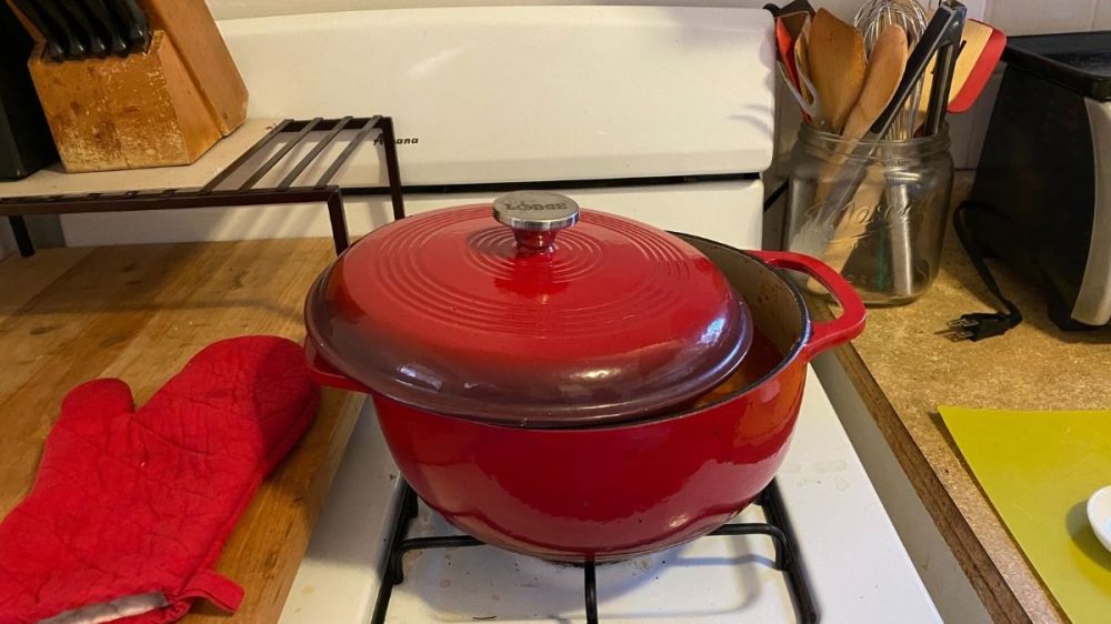 I make everything in this 6-quart enamel cast iron dutch oven. I paid more for this pot than any other single piece of cookware in my kitchen. I named her Francesca and I love her. She’s a workhorse and she’s my go-to soup vessel. Much like my 100+-year-old stockpot that belonged to my great grandmother, Francesca is stained, often used, and very well-loved. I will have her for a very long time.