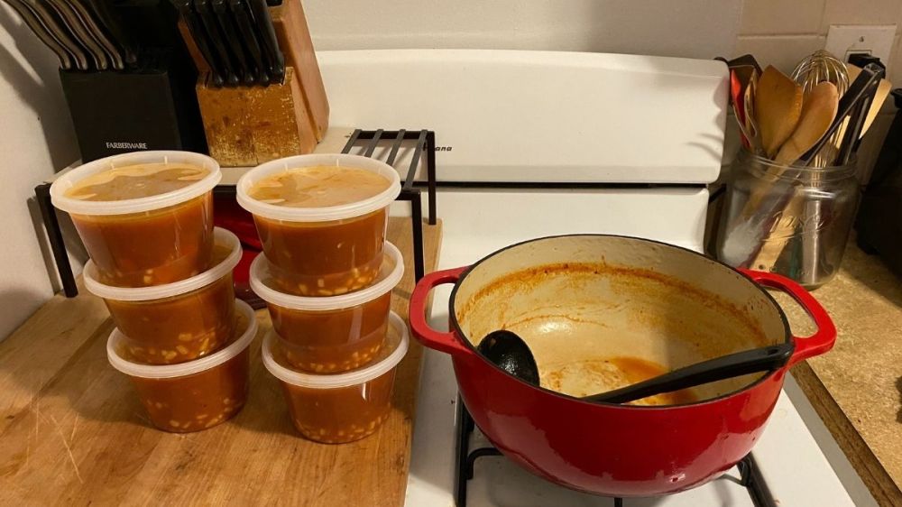 Sauté the veggies in butter, oil or both. Today I used some rendered bacon fat to sauté the veggies. So yummy! My go-to combo is carrots, celery, and onion. And of course garlic. Because I usually have those on hand. Garlic is also life. Add the garlic after the veggies have had time to soften a little so it doesn’t burn. Add the tomato product (if you use a can or tube of tomato paste, let it cook for a few minutes to “wake it up”) cook it all together for a few minutes. Sometimes I’ll add a can of corn or you can use frozen. Or a can of green beans. Literally, any veggie can be thrown in there.